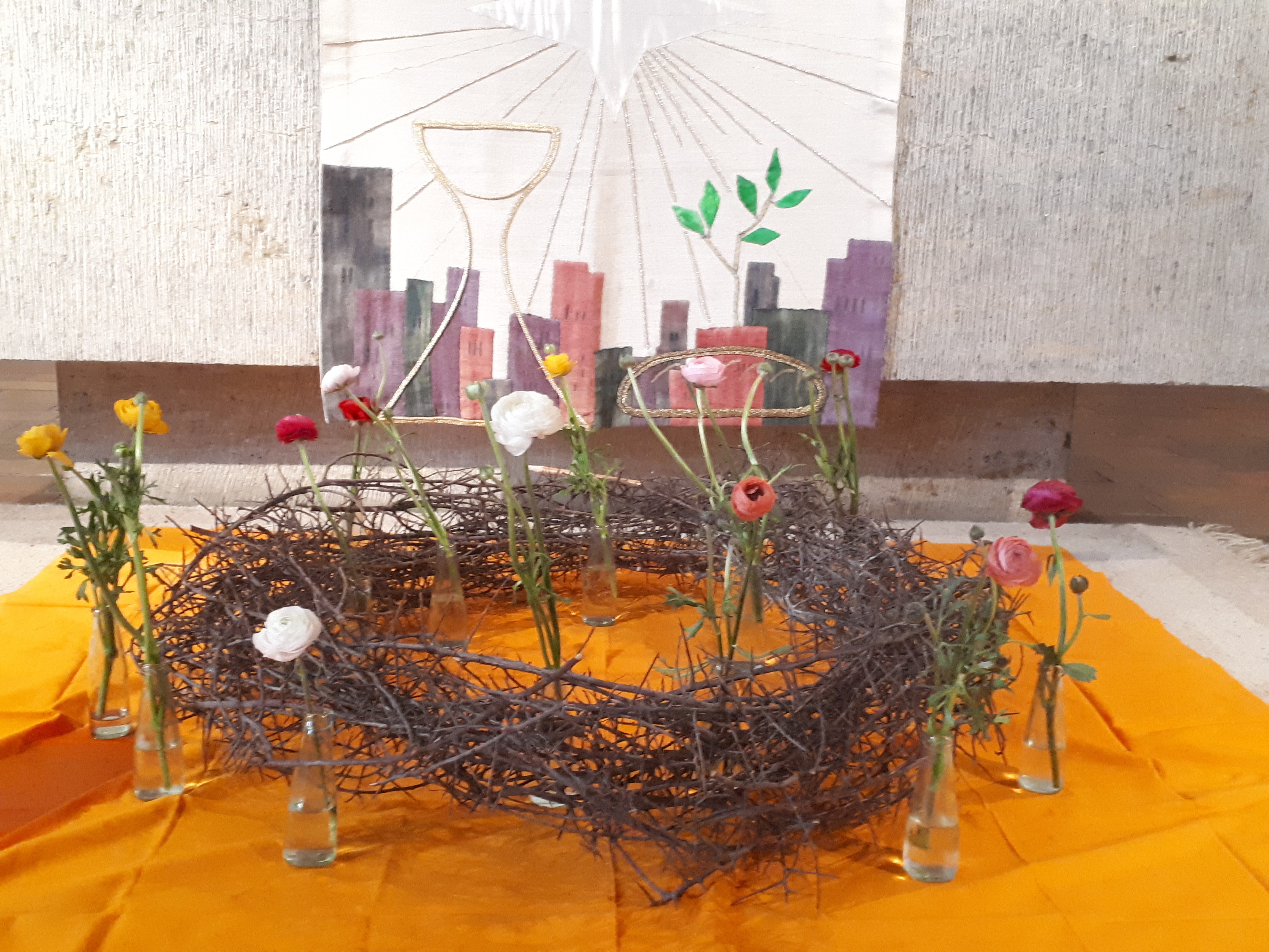 Für jede Begegnung mit Jesu Auferstehungsleben haben wir eine Blume in die Dornen gestellt – so blüht es zwischen den Dornen. Auch Ihnen viele blühende Erfahrungen!